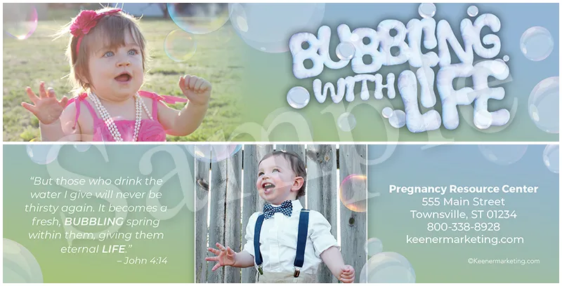 Keener Marketing, Inc. copyrights all our designs. They can not be printed or reproduced without written permission. Because we want to be a service to the pregnancy centers, we do allow centers with printers who donate their services or give them a special price, to purchase the pdf to print locally. If you would like to purchase the pdf, see the pdf pricing, or call for a quote.