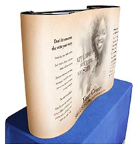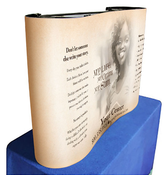 This easy affordable table top display is perfect for any event where you want to make a great impression but don't have a lot of space. Simply unroll your display, position the feet and you're ready. Price includes hardware and graphic. Graphics can be changed, but we reccommend sending it to us because the process can be tricky. Replacement Graphic: $165 (includes installation.)