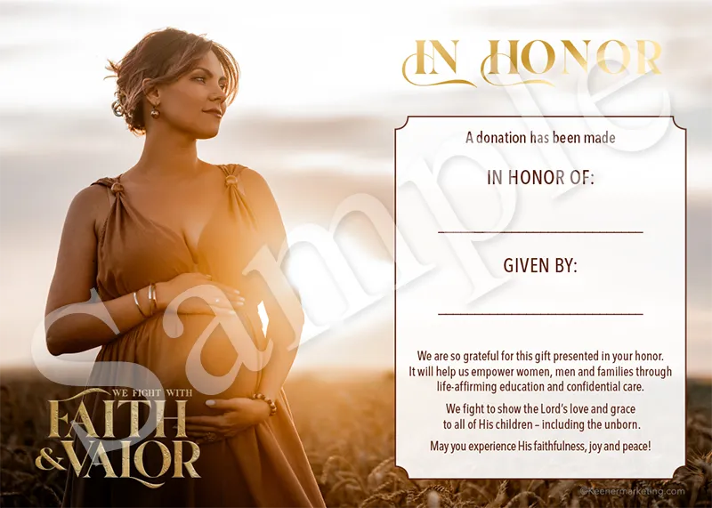We are grateful for this gift presented in your honor.It will help us empower women, men and families through life-affirming education and confidential care.Our purpose is to show the Lord's love and grace to all of His children – including the unborn. May you experience His faithfulness, joy and peace!"