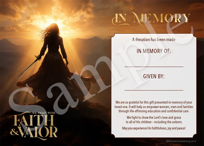 In Memory of:_________to support our ministry for LIFE! Given by: _________We are grateful for this gift presented in memory of your loved one. It will help us empower women, men and families through life-affirming education and confidential care. Our purpose is to show the Lord's love and grace to all of His children – including the unborn. May you experience His faithfulness, comfort and peace."
